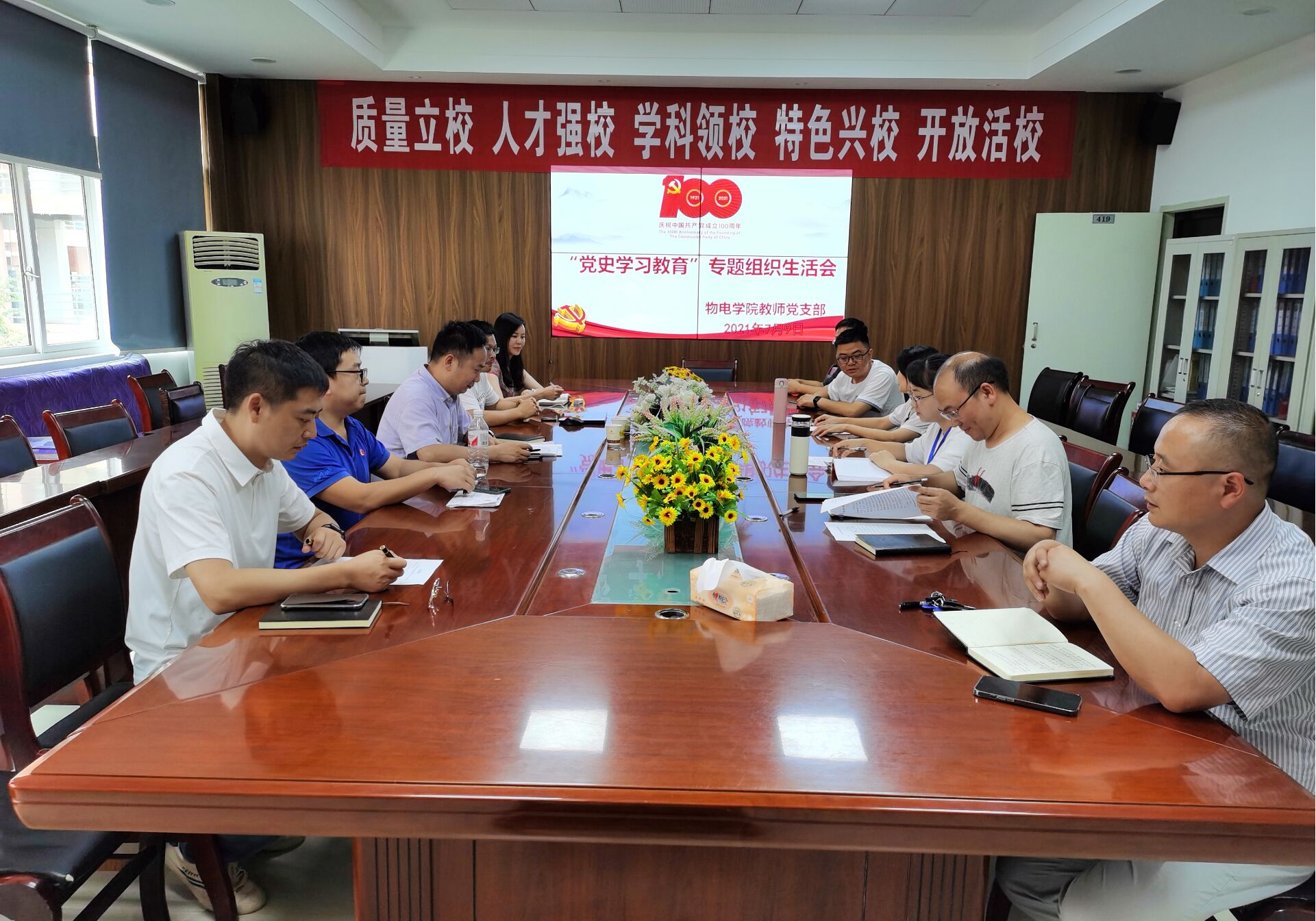 7月9日,物电学院教师党支部在宁静楼419会议室召开党史学习教育专题组织生活会。党支部书记刘家兴主持,全体党员教师参加。 物电学院教师支部围绕学习贯彻习近平新时代中国特色社会主义思想和习近平总书记在庆祝中国共产党成立100周年大会的重要讲话,紧扣“学史明理、学史增信、学史崇德、学史力行”要求,交流学习体会,查找差距不足,引导广大党员增强“四个意识”、坚定“四个自信”、做到“两个维护”,不忘初心、牢记使命,奋力前行,在新征程中不断谱写新时代贵州精神新篇。 会前,教师支部认真组织学习,按照《关于召开党史学习教育专题组织生活会的通知》要求,组织党员认真学习习近平总书记在党史学习教育动员大会重要讲话和习近平总书记在庆祝中国共产党成立100周年大会上的重要讲话。党支部委员之间、党支部委员和党员之间、党员和党员之间开展了谈心谈话。 会上,刘家兴向全体党员作了“牢记殷切嘱托、忠诚干净担当、喜迎建党百年”专题教育情况报告。随后,支部书记和支部委员逐一开展个人检视剖析,党员之间开展批评和自我批评,找寻自己的差距和不足。最后,党委书记熊德永对本次专题组织生活进行点评。