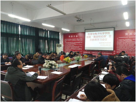 2019年12月31日上午11:30,,物电学院全体教职工在宁静楼419会议室,集中开展了“廉政和纪律”警示教育学习活动,参加此次警示教育活动的有全体教职工,由物电学院党委书记熊德永主持。 新年来临,即将放假之际,学院党委高度重视“廉政和纪律”教育工作,为落实学校《关于严明2020年元旦春节期间有关纪律要求的通知》(贵师院纪发〔2019〕16号)通知要求,为防止“四风”反弹,杜绝“节日腐败”,确保节日期间风清气正,熊德永要求全体干部、教职员工要把守纪律、讲规矩铭记心里,严守纪律规矩,遵守“八项规定”,做到令行禁止,坚决同腐败作斗争。其次,学院党委副书记、院长周筑文要求,全体教职工要牢固树立“四个意识”,自觉践行“两个维护”,在相关纪律面前,抓早抓小,禁止违规违法行为出现。最后,学院党委副书记于治鳞对全体教职工在节假日期间提出新的要求,要强化监督责任,形成监督新体系,发现问题“零容忍”监督纪律,强化执纪问责纪律要求。 此次“双节前廉政和纪律”警示教育是一次受洗礼的学习,全体教职工在学院党委领导下,从纪律规矩、责任担当、监督问责方面深入领会,认真贯彻落实中央八项规定、省委“十项规定”和省教育厅“六项规定”精神,保障学院清风正气,各项工作蓬勃发展。 (文图/向坤 审核/熊德永)