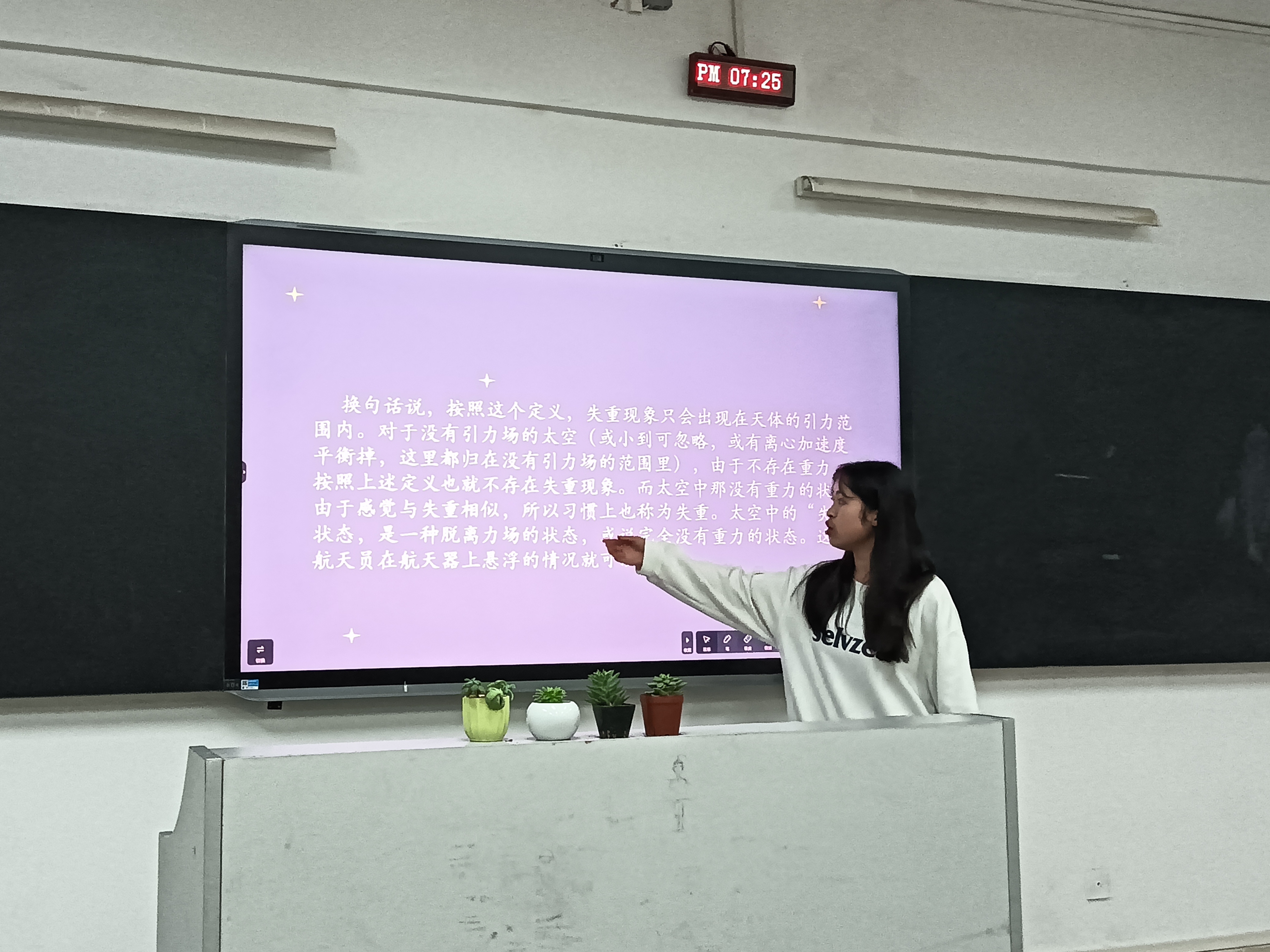 进一步宣扬崇尚科学、探索未知、勇于创新的新时代航天精神.5月19日,黑人av 在宁静楼429举办第二届“星光杯”科普讲解大赛预赛。本次比赛由22级旅游与文化学院的蔡洋主持。 首先,赛前每位选手都需要抽签决定出场顺序;接着,选手们分享自己对航空航天知识的了解;然后,随机抽取关于航天航空的知识命题进行回答;最后,由评委对选手进行提问。本次比赛选出两名优秀选手参加决赛,分别是22级集成电路与集成系统班苟源泉、物理一班何家杰。 本次比赛的进行,让同学们能了解到更多关于航天航空的知识,激发师院学子对航天航空知识领域的探索,让同学们知道并学习到新时代航天精神。