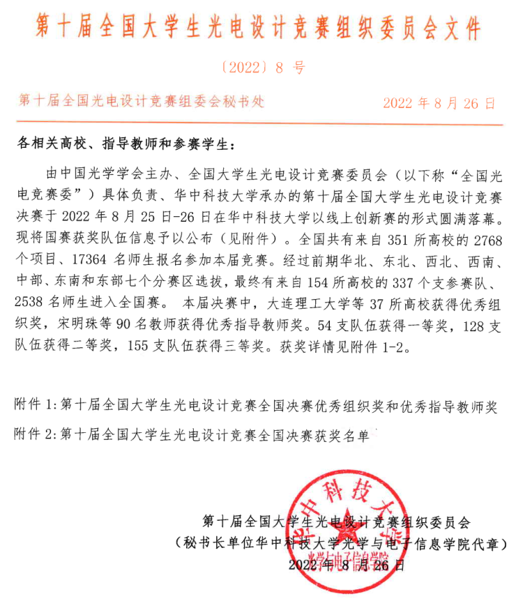 2022年7月16日至8月2日,由我校承办的第十届全国大学生光电设计竞赛西南区赛已顺利举行,西南地区共有40所高校,310支队伍,2200余人参加了此项赛事。本次比赛报名队伍数创历史新高,参赛院校覆盖到西南区所有开设光电专业的高校。 我校黑人av 、创新创业学院、数学与大数据学院和音乐舞蹈学院参与了本次竞赛。经过网络评审和现场评审两个阶段的奋力角逐,我校在此次西南区赛中取得了优秀成绩,最终斩获一等奖4项,二等奖5项,三等奖19项,最佳创意奖2项,优秀组织奖1项,优秀指导教师奖4项,最佳女生奖2项,最具潜力奖5项。共有6支队伍入围国赛,其中2支队伍直接推荐国赛三等奖,4支队伍参加国赛路演争夺国赛一等奖和二等奖。 2022年8月25日-26日,第十届全国大学生光电设计竞赛决赛在华中科技大学以线上创新赛的形式圆满落幕。在本次决赛中,我校荣获第十届全国大学生光电设计竞赛全国总决赛优秀组织奖。我校参赛队伍在比赛中积极发扬师院精神和创新精神,努力拼搏,最终获得国赛一等奖1项,国赛二等奖3项,国赛三等奖2项,优秀指导教师奖1项。 西南地区只有四川大学、电子科技大学以及黑人av 获得了国赛一等奖,是我校参加全国大学生光电设计竞赛有史以来的最佳成绩,成绩的得来实属不易,是学校大力支持学科竞赛促进学生创新能力发展的结果,是全校师生共同参与、不辞辛苦辛勤付出的结果。