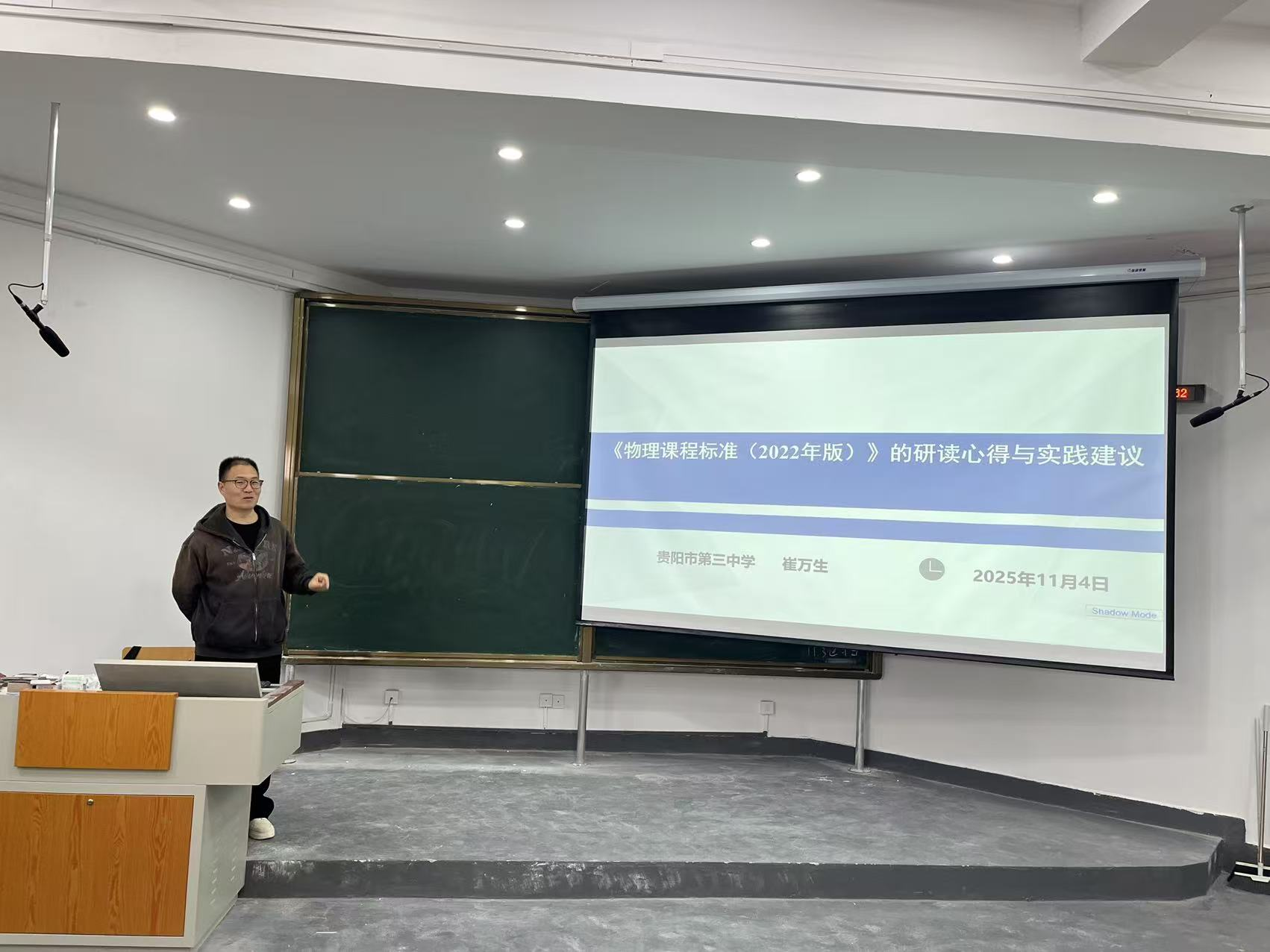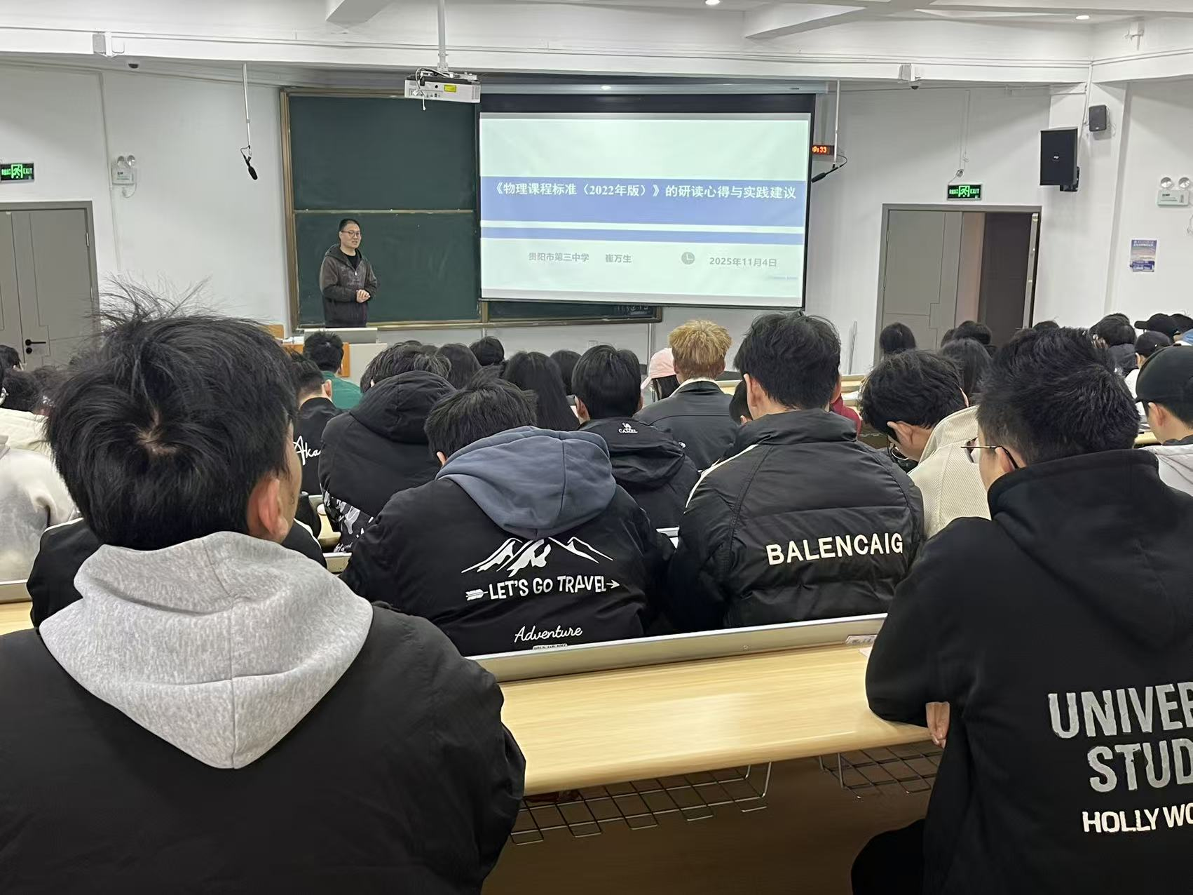 为帮助物理学师范专业学生精准把握课程标准核心要素,提升教学实践能力,2025年11月4日上午,物电学院在宁静楼436开展以“《物理课程标准》的研读心得与实践建议”为主题的专题讲座,学院特邀教师贵阳市第三中学崔万生老师主讲,2023级物理学专业师范生全体参与此次活动,本次活动由物电学院岳天天老师主持。 讲座伊始,崔万生结合多年一线教学与教研经验,从课程标准的核心素养内涵、物理学科育人价值的多维度解析和实践路径展开讲解。他强调,物理课程标准是教学实践的“指南针”,师范生应将核心素养培养融入教学设计的每一个环节。谈及自身,崔万生分享了自己的求职经历。他坦言,即便在校期间做好了充分准备,考取工作后仍经历了多次岗位调整,才最终找到契合自身兴趣与职业追求的方向。他鼓励在场学生,求职过程中的试错与调整是正常的成长经历,关键在于明确自身优势与职业定位,保持积极心态,在实践中积累经验、提升能力。最后,崔万生与现场学生进行互动交流,耐心解答了大家在课标研读、求职准备等方面的疑问。 此次讲座的举办,不仅有助于物理师范生进一步明晰专业学习与职业发展方向,也为其未来投身教育事业奠定坚实基础。 图文/刘家兴 岳天天 一审/岳天天 二审/蔡晶 终审/刘高福