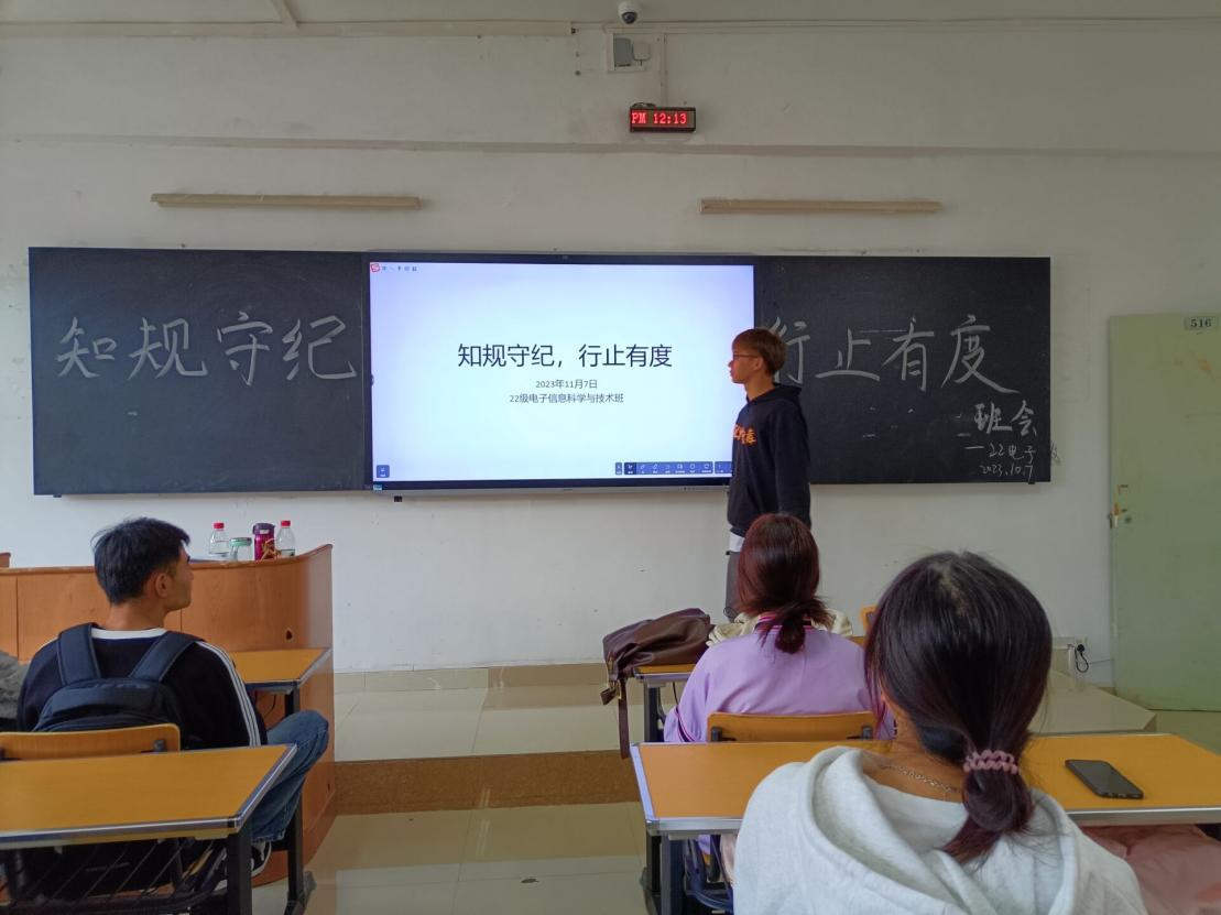 为了强化学生纪律教育和日常行为规范引领,促进学院学生养成良好的学习和生活日常文明行为习惯,强化学生自我管理机制,增强纪律意识、规矩意识,全面了解学校各项规章制度。2023年11月3日-11月9日,黑人av 各级辅导员、班主任分别组织各年级学生通过线上、线下开展了“‘知规守纪、行止有度’纪律教育暨日常行为规范教育”主题班会。 在班会中,各年级辅导员和班主任主要带领学生们一起学习了《黑人av 学生手册》,重点学习了《普通高等学校学生管理规定》(教育部令41号)《高等学校学生行为准则》(教学〔2005〕5号)《黑人av 学生违纪处分办法》《黑人av 学生公寓管理办法》《黑人av 学生请假和外出管理办法》等内容。同时,辅导员、班主任们结合具体案例,从树立法治思维、增强规矩意识,谨记制度规定、知文件精神、做有为青年等多个方面系统讲解了大学生遵纪守法、做文明有为青年的重要性。 通过此次主题班会,进一步促进学院学生树立正确的人生观、价值观和世界观,提升纪律意识和责任意识,促进学生德智体美劳全面发展,为建设师院“求真务实,自强不息”的校风和“立志勤学,知行合一”的学风,营造文明和谐安全的育人环境贡献力量。