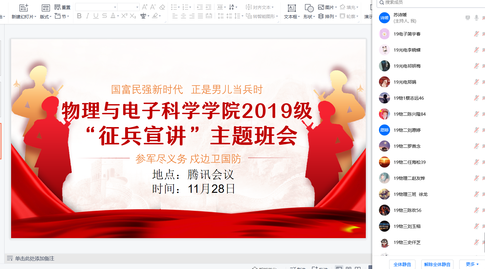 为全面贯彻习近平新时代中国特色社会主义思想,深入贯彻习近平强军思想,以高度的政治责任感和使命感学习宣传贯彻党的二十大精神,坚持人才强军,扎实开展国防教育工作,努力为国防事业输送更多优质兵员,物电学院毕业班班主任苏诗媛组织19级全体学生开展“青春礼赞二十大 强军有我新征程”国防教育线上主题班会。 班会上,苏诗媛首先带领全体学生学习了《高举中国特色社会主义伟大旗帜 为全面建设社会主义现代化国家而团结奋斗——在中国共产党第二十次全国代表大会上的报告》;紧接着,学习了《中华人民共和国兵役法(2021年修订版)》《中华人民共和国退役军人保障法》等国防法规;然后对普通高校学生就业政策、应征入伍政策公告、贵州省征兵工作优抚办法、乌当区征兵优抚办法、黑人av 在校学生应征入伍优抚办法、应征入伍前置招聘等相关内容进行讲解。 最后介绍了大学生兵员征集条件、入伍流程等相关内容,并对同学们的应征入伍问题给与解答。 2023年,是学习贯彻党的二十大精神,深化国防动员体制改革的重要一年,做好征兵工作意义重大、责任重大。希望青年学子响应祖国号召,积极到部队中锻造成长,把聪明才智融入强军梦想,用青春年华谱写壮美人生篇章。