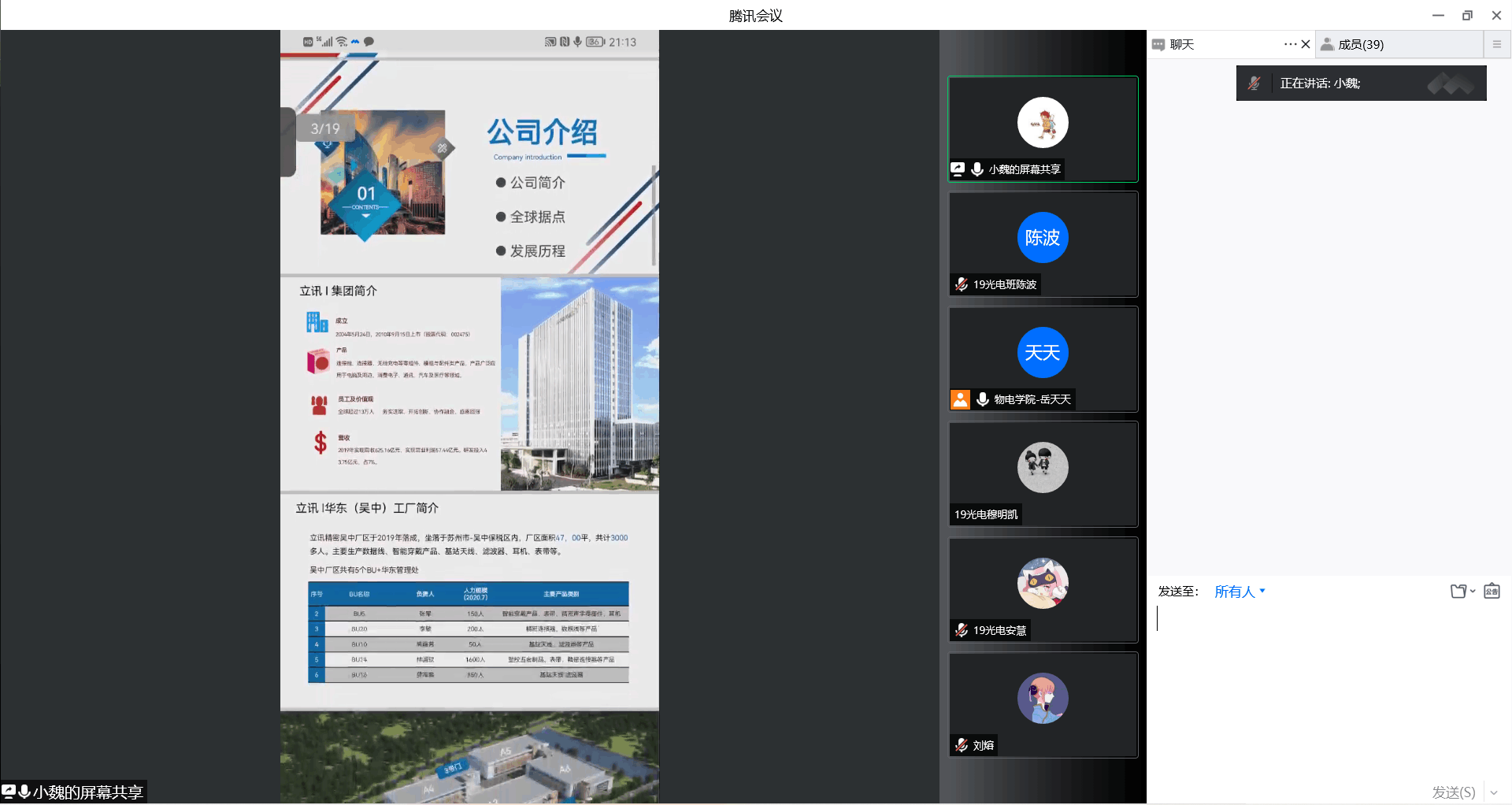 为保障下学期实习工作的顺利开展,使电子信息类专业学生有更好的实习就业机会,并对毕业后的就业有更深的了解,物电学院联合苏州立讯精密工业有限公司于6月26日晚上举行线上会议。会议由物电学院教学科研管理科科长岳天天主持,立讯精密工业有限公司人事主管魏小升主讲,物电学院2019级电子信息类全体同学参加了此次企业实习宣讲会。 首先魏小升详细介绍了苏州立讯精密工业有限公司基本情况,包括公司业务范围、工作内容以及工作薪资、生活食宿等问题,并详细解答了同学们对于实习工作的疑问,让同学们对实习单位有一个全面的了解以便选择适合自己专业的实习工作。 最后岳天天对本次会议做了总结,为学生实习了解了更多可能遇到的问题,并且希望同学们都能找到一个理想的实习岗位,顺利完成实习工作。