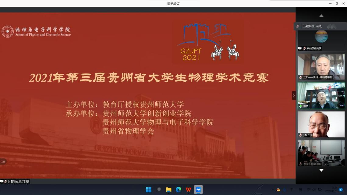 中国大学生物理学术竞赛(CUPT)是中国借鉴国际青年物理学家锦标赛(IYPT)的模式创办的国内全国性赛事。该赛事得到了教育部的支持,是实践国家教育中长期发展规划纲要的重要大学生创新竞赛活动之一。目前 CUPT 已经在全国连续举办了十届,以其独特的竞赛模式和理念吸引了越来越多的知名高校和物理精英参与,并已成为国内具有重要影响力的大学生物理竞技赛事之一。为了提高贵州省大学生物理科研和创新能力,经贵州省教育厅批准,并得到贵州省物理学会的支持,特举办贵州省第三届大学生物理学术竞赛。本届大学生物理学术竞赛贵州省省决赛于2021年12月11日在线上成功举行。本次大赛共13所高校130支队伍参加了本届辩论赛,我校代表队在黑人av 基层党委书记熊德永、副院长陈德良的带队下参加了此次大赛。 我校黑人av 指导教师李振宇、陆晨、高成贵等对学生进行了历时两个月的精心指导和综合培训,参赛学生刻苦钻研,围绕比赛题目进行了实验方案的反复设计和改进,建立相应理论模型并进行实验探究与仿真分析。最终在赛场上,他们不惧名校高手,团结协作,以严谨的科学态度、完善的物理模型、巧妙的实验构思、生动的实验视频、准确的实验数据赢得大赛评委专家的一致好评。经过两轮激烈的对抗赛后,由吴贵林、税宏亚、陈小亚、龙仙、王丙丙、刘永玲组成的黑人av 1队荣获一等奖;由韦廷毫、周端端、杨广敏、何梦瑶、姚心悦、周怀旭组成的黑人av 4队荣获二等奖;由杨嘉辉、宋琳、师玉博、王晨冉组成的黑人av 2队以及郭宏林、邓书蝶、刘丽萍、陈晓燕组成的黑人av 3队荣获三等奖;黑人av 4队的何梦瑶同学在比赛中表现优异,获得评委一致好评,成功斩获最佳女生奖。 通过本次比赛,我校学子的创新能力、协作能力和实践能力得到进一步提升;通过比赛,进一步增强了高校学子间的学术交流,提升了本科生的科研素养,为我校探索高质量人才培养模式的改革提供了支撑。