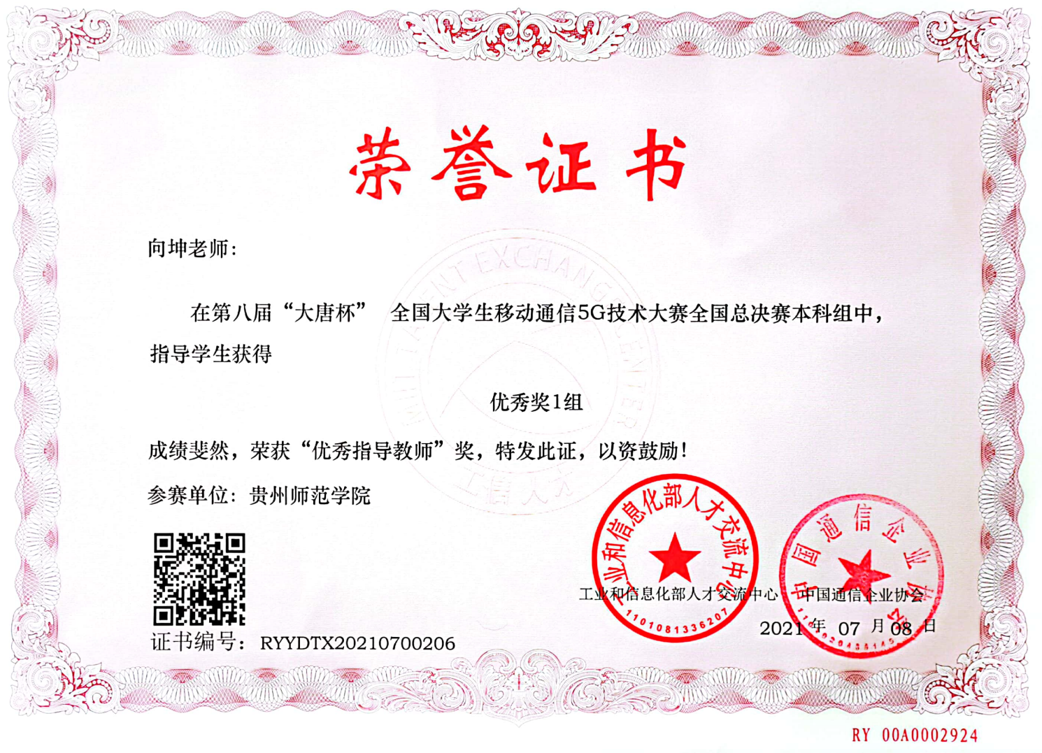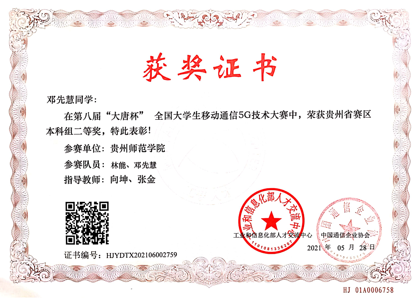 6月26日,全国普通高校学科竞赛中的第八届“大唐杯”全国大学生移动通信5G技术大赛全国总决赛在北京工业大学举行。我校代表队在物电学院李荔老师的带队下参加了此次总决赛。 本次大赛由国家工业和信息化部、中国通信企业协会主办,大唐移动通信设备有限公司、北京市教委北京高校电子信息类专业群承办,北京工业大学、北京邮电大学协办。此次赛事覆盖全国30个省市自治区,300余所院校参加,包含了哈尔滨工业大学、国防科技大学、武汉大学、电子科技大学、兰州大学等多所985和211建设院校约1700余名师生参加本次总决赛。大赛筹备期间,物电学院党委书记熊德永以及学院办公室主任向坤老师与大唐移动集团张金工程师对电子信息类专业的李娜、袁国圆、邓先慧、林能4名学生进行了精心指导和综合培训,经过学生们三个月的不懈努力,5月份参加了贵州省选拔赛,并荣获省级一等奖和省级二等奖。最终李娜、袁国圆组合更是顺利通过省级选拔赛参加了北京工业大学的总决赛,赛场上,选手们沉着冷静,团结协作,与各校优秀学子同台竞技,通过理论与应用的交流学习,提升了学生的专业、科学素养,培养了他们的创新能力和实践能力,为5G通信高端人才的输出打下坚实基础。