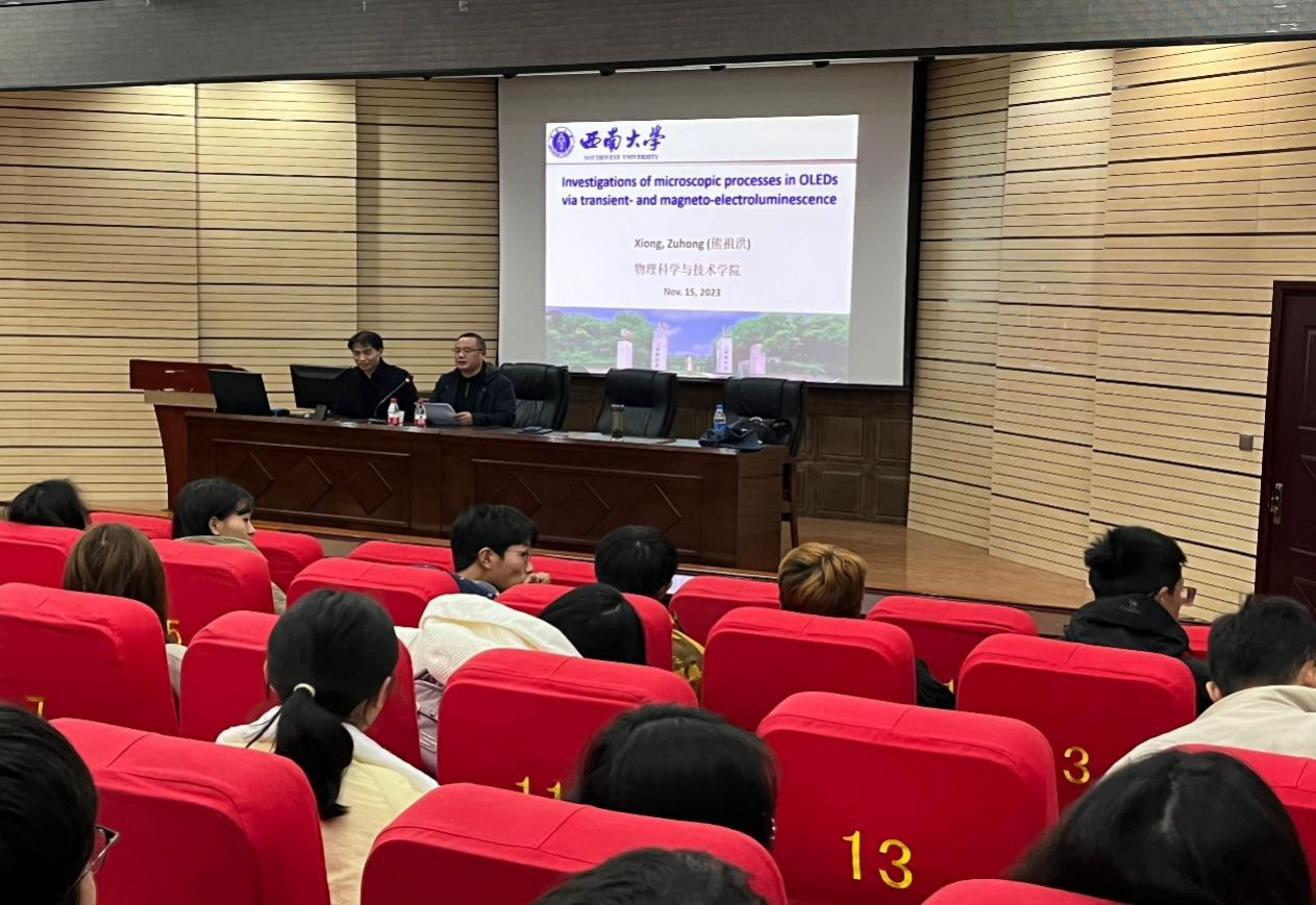 2023年11月15日上午,西南大学物理学院熊祖洪教授为黑人av 师生展开了题为” 采用瞬态电致发光和发光磁效应研究OLEDs的微观演化机制”的学术讲座。其间熊教授对其课题组近年来通过磁效应(magneto-electroluminescence: MEL)和瞬态电致发光(transient electroluminescence: TEL)作为有机发光二极管(OLEDs)中发光中载流子和激子演化行为的探测工具取得的科研成果做出了深入浅出的介绍。并与在场师生开展热烈的学术讨论,同时对研究生选拔和培养等学生关注的问题做了详细的介绍。 · 讲座之后熊教授在黑人av 会议室开展了2024年国基金申报指导活动。期间熊教授针对两位青年教师的科学研究问题展开了细致深入的交流,对今后的研究工作规划、研究困难的突破方法等方面提出了宝贵意见,并承诺后续可以按照需求进一步详细指导基金申报的具体内容,同时可以为后续的研究工作提供良好的条件支持以及合作空间。 通过此次学术交流工作,不仅使黑人av 师生对有机发光二极管的基本机理上有了深刻的认识,拓展了了大家的科学视野,更是了解到科学研究对严谨工作态度的要求,同时对参会老师在今后基金申报工作中产生了积极的意义。讲座和会议均由学院陈德良副院长主持。